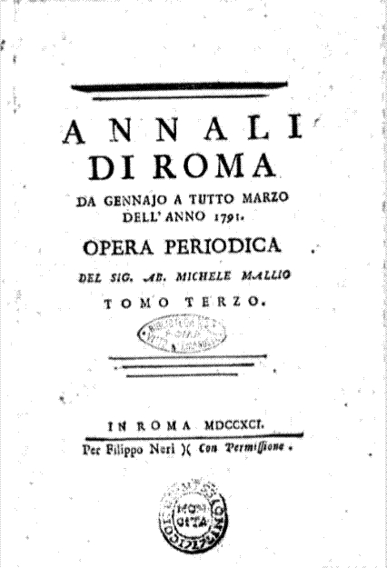 3) Annali di Roma da Gennaio a tutto Marzo dell’anno 1791, Volume 3 a cura dell'abate Michele Mallio, pag. 116.