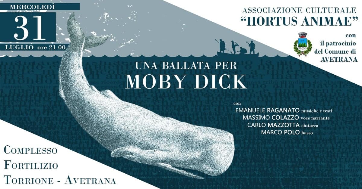 Mercoledì 31 luglio, alle ore 21, “Una ballata per Moby Dick”, il reading musicale del compositore salentino Emanuele Raganato, sarà presentato per la prima volta ad Avetrana grazie all’impegno dell’associazione culturale “Hortis animae”.