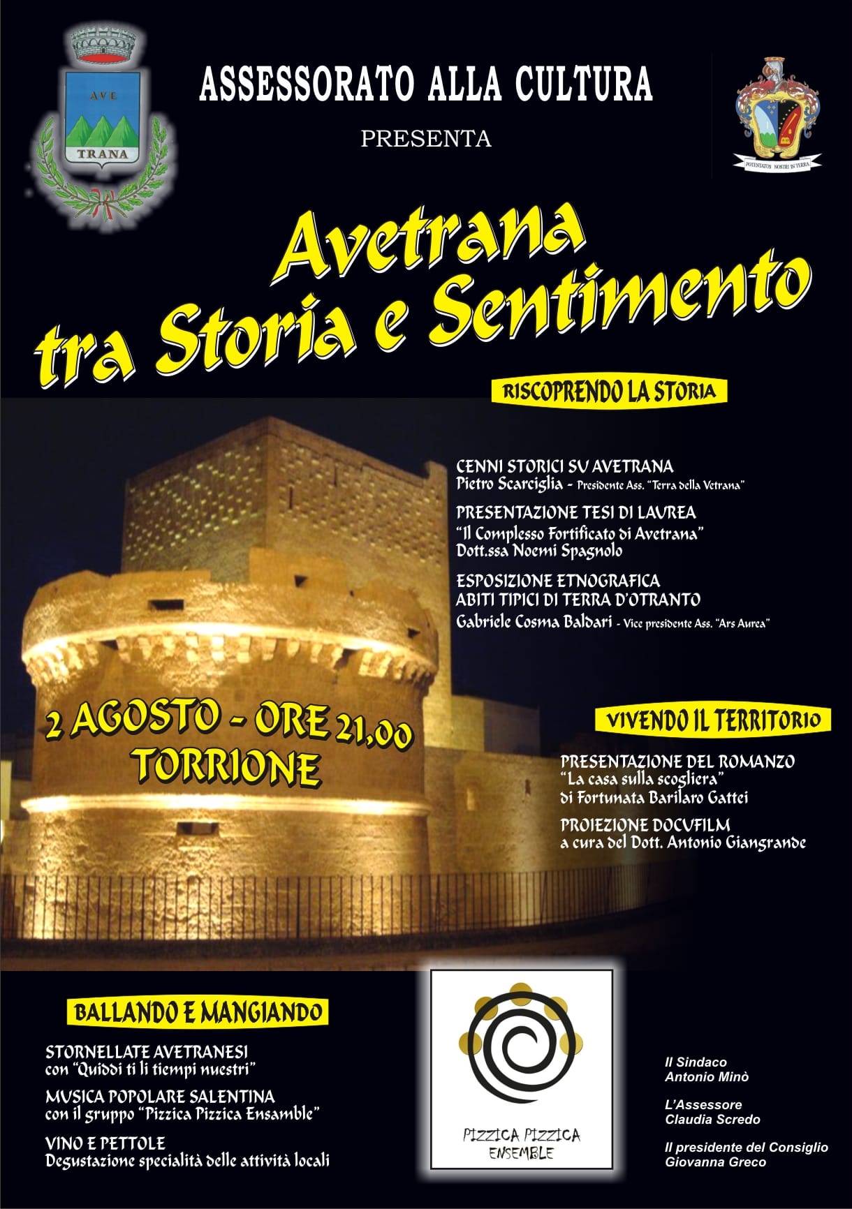 BALLANDO E MANGIANDO – La terza e ultima sezione partirà con l’esecuzione di stornellate avetranesi ad opera del gruppo “Quiddi ti li tiempi nuesci”. Si proseguirà con la musica popolare salentina del gruppo “Pizzica pizzica ensemble”. La serata sarà chiusa dalla degustazione di pettole e vino.