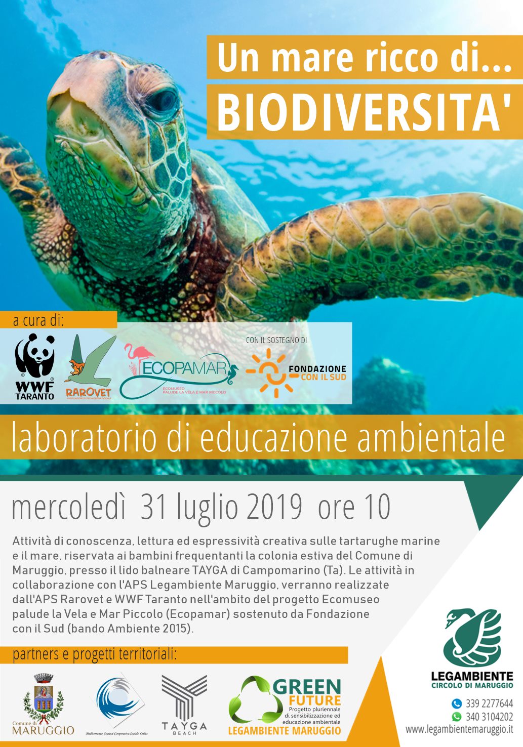 Attività di conoscenza, lettura ed espressività creativa sulle tartarughe marine e il mare, - in collaborazione con l’APS Legambiente Maruggio - verranno realizzate dall’APS Rarovet e WWF Taranto nell’ambito del progetto Ecomuseo Palude la Vela e Mar Piccolo (Ecopamar) sostenuto da Fondazione con il Sud (bando Ambiente 2015).
