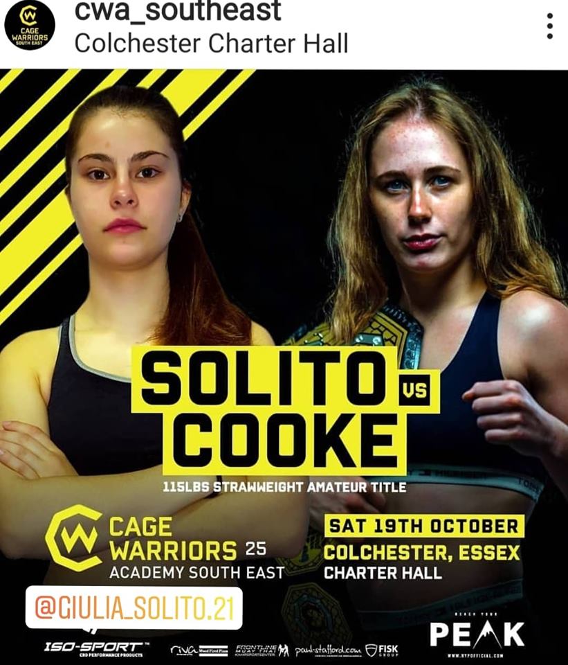 C’è l’ufficialità: l’atleta manduriana Giulia Solito (Centurion Club) volerà in Inghilterra per affrontare, il 19 ottobre prossimo, la campionessa in carica Chloe Cooke. In palio la cintura continentale dei pesi strawweight (115libbre), una delle cinture più importanti e ambite in Europa.
