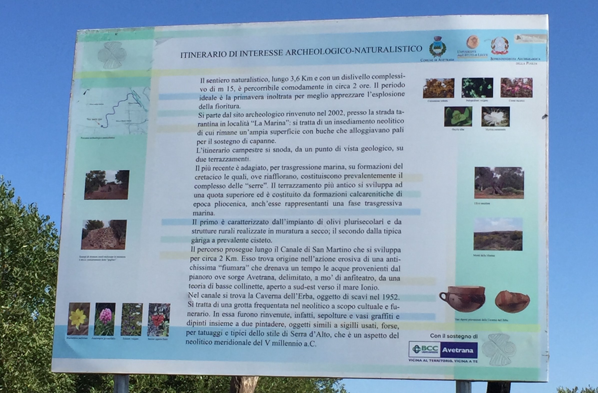 Un grande cartellone che descrive la presenza di un sito di interesse archeologico in un’area adiacente masseria “La Marina”. Pubblicizza un percorso naturalistico da visitare. In realtà, però, il percorso è assolutamente impraticabile…