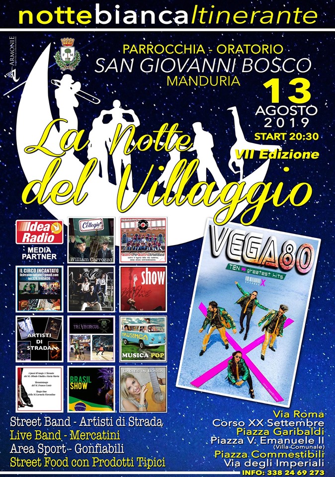 Il centro della città di Manduria farà da cornice, questa sera, alla settima edizione de “La notte del villaggio”, la notte bianca proposta dalla parrocchia e dall’oratorio “San Giovanni Bosco” e patrocinata dal Comune di Manduria.
