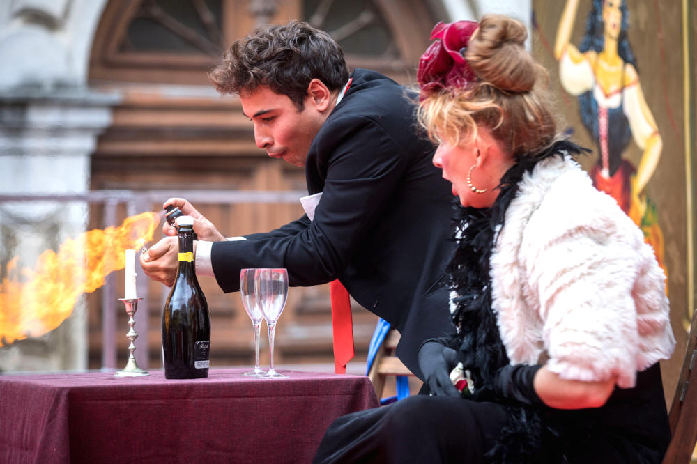 Nella prima parte della serata si ride con le scoppiettanti gag comiche dello spettacolo “Just Married”, ad opera della compagnia “The Squasciò” (da Torino), che propongono il “più catastrofico love show che abbiate mai visto”! "Just Married" è la storia di due clown alle prese con uno dei momenti più importanti della vita: la proposta di matrimonio. Un giorno in cui tutto dovrebbe andare per il verso giusto accade invece il contrario, e la cena romantica a lume di candela della coppia, che fra peripezie ed esilaranti errori ne combina di tutti i colori, diventa una irresistibile commedia comica in cui è coinvolto anche il pubblico! [Spettacolo vincitore Premio Artusi 2018, sez. Artisti di Strada].