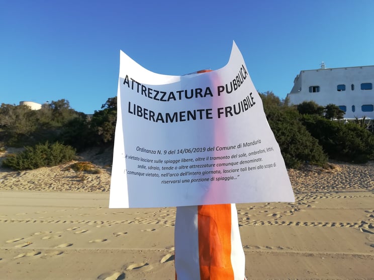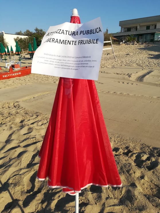 Un plauso a questa iniziativa, con la speranza che possa servire a qualcuno per rendersi conto che si tratta di una ingiustizia. Se non dovesse funzionare? Altrove intervengono Guardia Costiera, vigili e altre forze dell’ordine per sequestrare ombrelloni e sdraio. Perché non si interviene anche a Manduria?