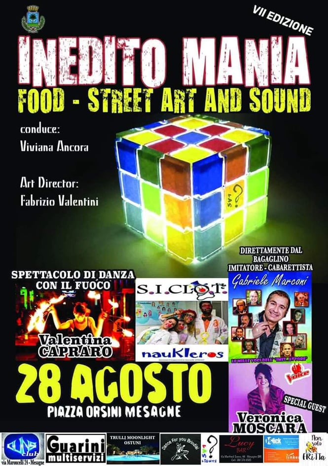 Mentre in piazza ci saranno stand gastronomici, la settima edizione dell’evento “Inedito Mania”, inserita nella programmazione dell’Estate Mesagnese e patrocinata dal Comune di Mesagne, vedrà l’alternarsi di musica live e cabaret.