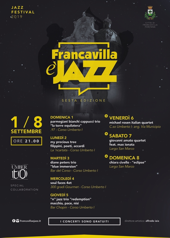 Come per tutte le edizioni, anche il ricco carnet del Francavilla è Jazz 2019 propone un’eccelsa qualità artistica, oltre alla consueta valorizzazione dei suggestivi ed eleganti scorci del centro storico francavillese, tratti distintivi di questa prestigiosa kermesse. Tutto ciò per merito delle scelte azzeccate da parte del direttore artistico Alfredo Iaia, del Comune di Francavilla Fontana interessato a promuovere la cultura, degli sponsor privati pronti a fornire il loro fondamentale contributo, così come degli esercizi commerciali, che specialmente per questa edizione hanno creduto fortemente in Francavilla è Jazz e nell’arte.