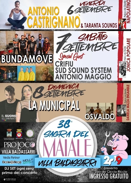 È l’evento più atteso di fine estate, che torna puntuale, all’avvio di settembre, nel piccolo borgo di Villa Baldassarri, frazione di Guagnano. Venerdì 6, sabato 7 e domenica 8 settembre andrà in scena la 38ª Sagra del maiale, storico evento a firma della Pro Loco di Villa Baldassarri realizzato in collaborazione con il Comune di Guagnano e la partecipazione del progetto Il suono illuminato, con il patrocinio di Regione Puglia e Unione dei Comuni del Nord Salento. A fare da protagonista un mix storico, quello tra i migliori sapori della cucina salentina e la musica più in voga del momento, che si riconferma, ogni anno, attrattore potentissimo per i tanti visitatori, giovani e meno giovani, che giungono nel piccolo paese salentino rendendolo contenitore straordinario di svago e sorrisi, dove chiudere in bellezza la stagione del divertimento per eccellenza.