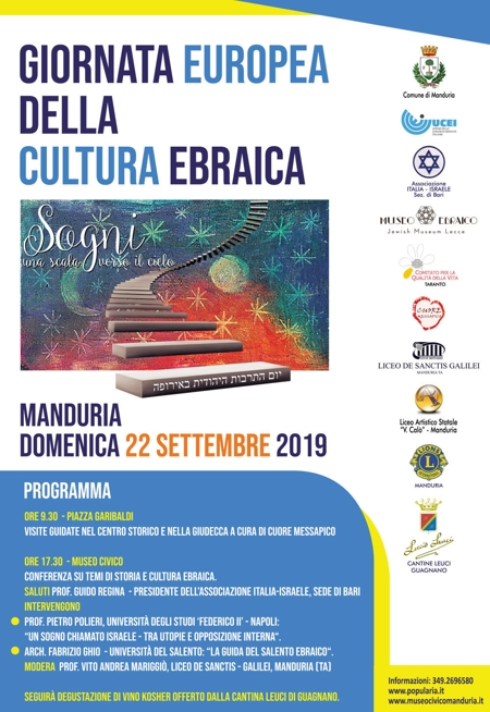 Per il secondo anno consecutivo, domani (domenica), in occasione della XX Giornata Europea della Cultura Ebraica, Manduria ospiterà alcune iniziative culturali inserite nel palinsesto degli eventi organizzati dall’Unione Comunità Ebraiche Italiane. Lo scopo è quello di diffondere la storia e le tradizioni di una cultura millenaria, la cui conoscenza risulta per noi occidentali indispensabile, al pari della cultura greco-latina.