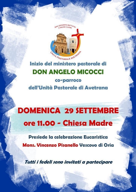 «Domenica 29 settembre, alle ore 11, inizierò il ministero pastorale nella comunità di Avetrana con la Santa Messa presieduta dal nostro Vescovo Vincenzo.