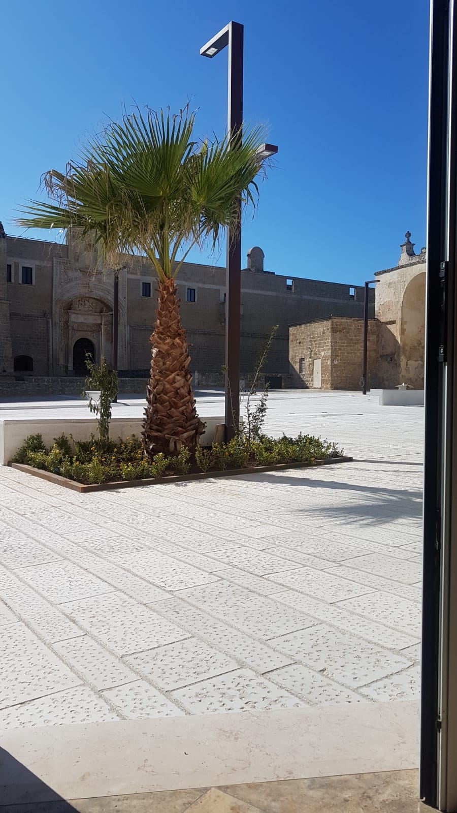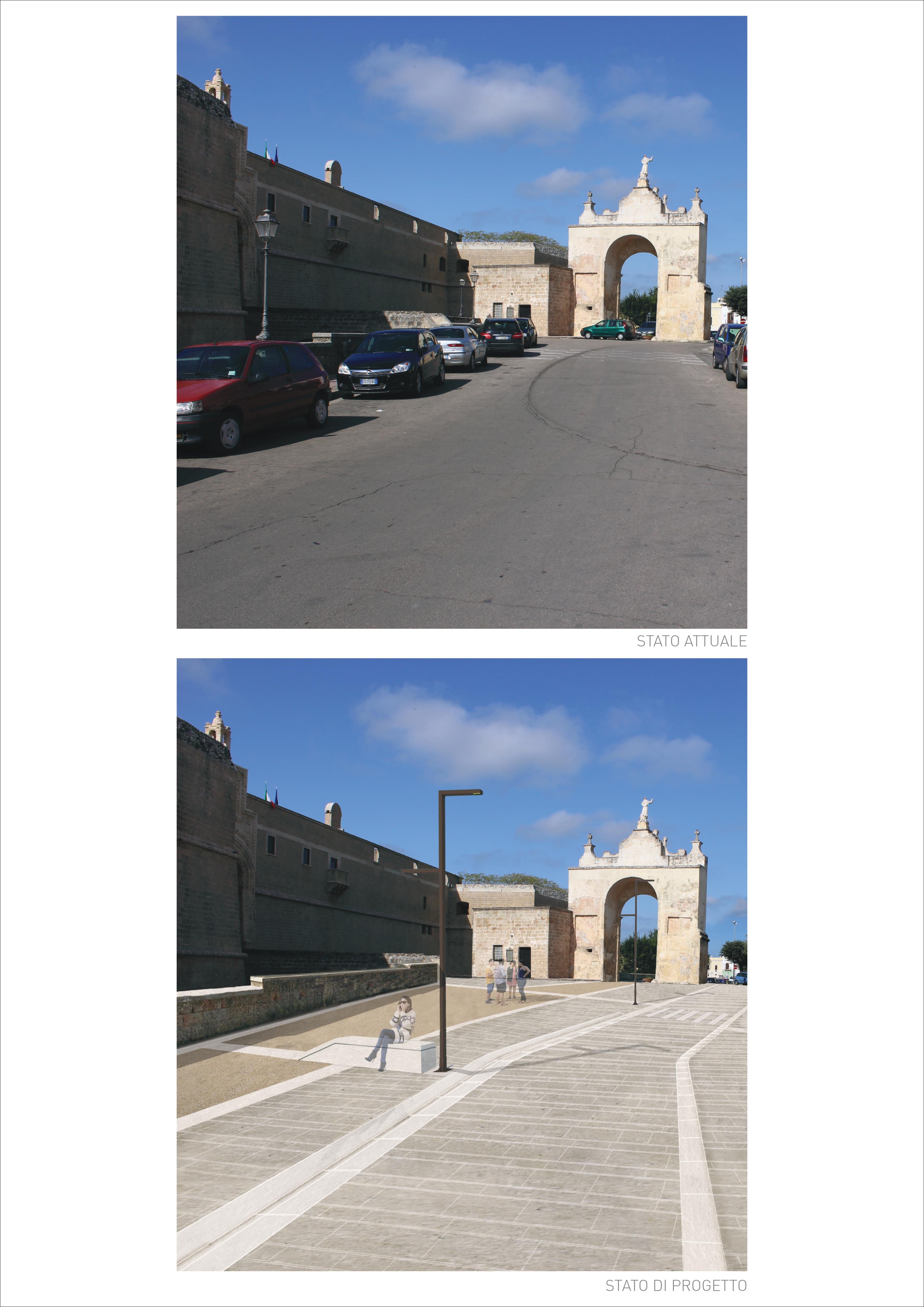«La piazza si presentava come un ampio e disordinato parcheggio selvaggio: asfalto, mattonelle di cemento di ogni colore, tracce di sottoservizi, portarifiuti e segnaletica arrugginiti e/o inesistenti» ricorda l’arch. Andrea Casto. «Il progetto, ambizioso, ha osato portare in un contesto storico del Salento materiali locali e tipici della nostra architettura e tradizione, usati con un tratto moderno e minimal come nel tipico stile dei progettisti.