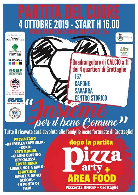 Tutti in campo: il 4 ottobre si svolgerà un quadrangolare della solidarietà di calcio a 11, che avrà la finalità di raccogliere una somma da devolvere in beneficenza alle famiglie di Grottaglie che vivono in una condizione di povertà e di disagio sociale, colpite dalla crisi economica o con problemi particolarmente gravi. Nella “partita del cuore” si confronteranno le formazioni di quattro quartieri di Grottaglie: 167 Nord, Capone, Savarra e Centro Storico; in un intervallo tra gli incontri di calcio si esibiranno – sempre sul campo – le formazioni dell’amministrazione comunale e dei ragazzi del centro diurno per disabili psichici Epasss. Presentano la manifestazione Cosimo Sanarica, in arte Kokò e la giornalista Raffaella Capriglia. Tutto il ricavato dei biglietti per l'ingresso allo stadio sarà devoluto alle famiglie di Grottaglie che vivono in condizioni di povertà. Il costo del biglietto per l'ingresso allo stadio, che sarà devoluto in beneficenza, è di 2,50 euro. Per acquistarlo, si può telefonare al numero 3291438241 oppure chiedere informazioni negli esercizi che espongono la locandina dell'evento.