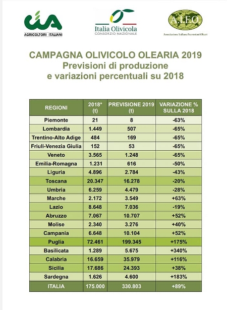 Un’ottima annata per la Puglia (+175%), che da sola produrrà quasi il 60% dell’olio extravergine d’oliva nazionale: il tacco d’Italia sarà trainato dalle province a maggior trazione olivicola, Bari, Bat e Foggia su tutte, le zone falcidiate dalla terribile gelata nel febbraio 2018.