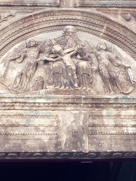 Il bassorilievo, abilmente scolpito dal maestro Raimondo da Francavilla raffigura, come noto, la Santissima Trinità con, disposti su entrambi i lati, due angeli ritti che sorreggono le calate di una tenda.