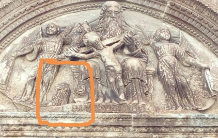 Parlo di un particolare, credo finora ignorato ed inedito, della lunetta dello splendido portale cinquecentesco che, nella parte destra (o sinistra per chi guarda), cela la figura di un ignoto personaggio.