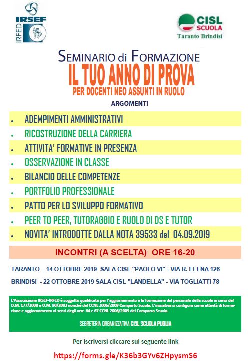 La Cisl Scuola Taranto - Brindisi, in collaborazione con l’istituto di formazione Irsef Irfed organizza il seminario formativo