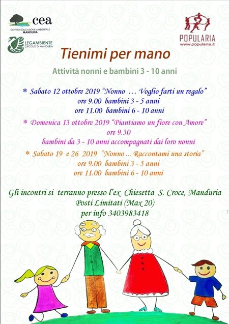 Ulteriore iniziativa è la serie di incontri e laboratori dal titolo “Tienimi per mano”, dedicati a bambini da 3 a 10 anni e ai loro nonni.