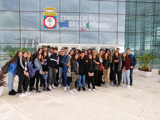 Venerdì scorso, gli studenti e le studentesse delle classi seconde frequentanti l’indirizzo Civis - 2A dell’indirizzo Classico, 2B e 2C dell’indirizzo Scientifico - del liceo “De Sanctis Galilei” di Manduria, accompagnati dalle loro docenti, prof.sse Caputo Antonella e Carone Emma, hanno effettuato una visita guidata presso il Consiglio Regionale della Puglia a Bari. Il gruppo è stato accolto dai funzionari responsabili della biblioteca che hanno svolto, all’interno della stessa, un’interessante attività di “brainstorming”, rivolta a spiegare alcuni concetti fondamentali riguardanti i simboli, l’organizzazione e il funzionamento della nostra Regione. I ragazzi hanno potuto, in particolare, conoscere la composizione dello stemma che riporta una corona dedicata a Federico II di Svevia, sei palline verdi che indicano le sei province pugliesi, l’ottagono che ricorda Castel del Monte, il celeste che evoca il mare della Puglia e l’ulivo come simbolo di pace.