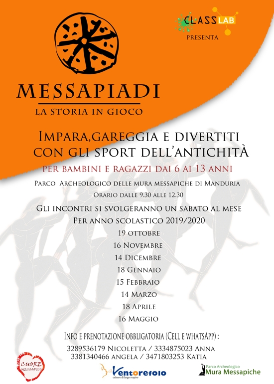 Nell’ambito delle consuete attività di ClassLab e nello spirito di Cuore Messapico, per il periodo 2019-2020 si aggiungono otto appuntamenti con lo sport, la storia e il divertimento, per bambini e ragazzi dai 6 ai 13 anni. Un sabato al mese, ogni mese sino a maggio 2020, la settimana scolastica corta si allunga con divertenti mattinate all'aria aperta e l'opportunità unica di sfidarsi nelle discipline sportive dell'antichità.