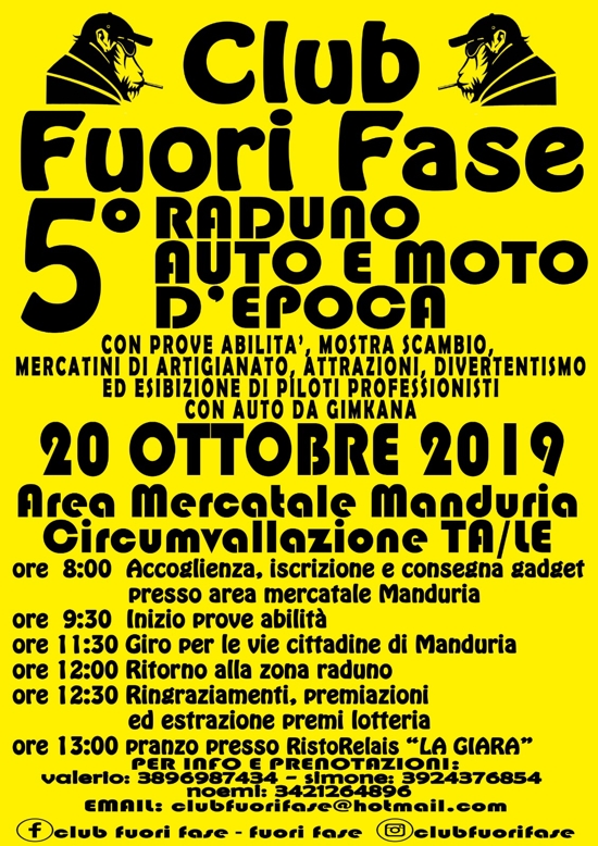 «Il club “Fuori Fase” nasce a Manduria dalla passione di un gruppo di ragazzi per le auto e moto d’epoca e con lo scopo di valorizzare quei mezzi che hanno fatto la storia» si legge in una nota della presidente Ilaria Muscogiuri. «Ogni anno vengono organizzati raduni nella nostra città per consentire alla gente in generale e agli appassionati in particolare la possibilità di ammirare le due e quattro ruote di un tempo. Ciò consente agli appassionati di ritrovarsi tutti insieme e trascorrere giornate ricche di emozioni.