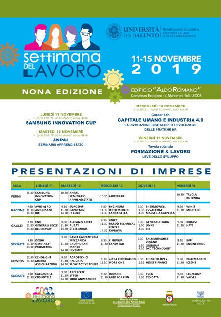 Cinque giornate per l’incontro tra imprese che cercano personale qualificato e studenti, neolaureati e dottorandi/dottori di ricerca dell’Università del Salento: dall’11 al 15 novembre 2019 in programma la nona edizione della “Settimana del Lavoro”, organizzata dall’Ufficio Career Service dell’Ateneo.