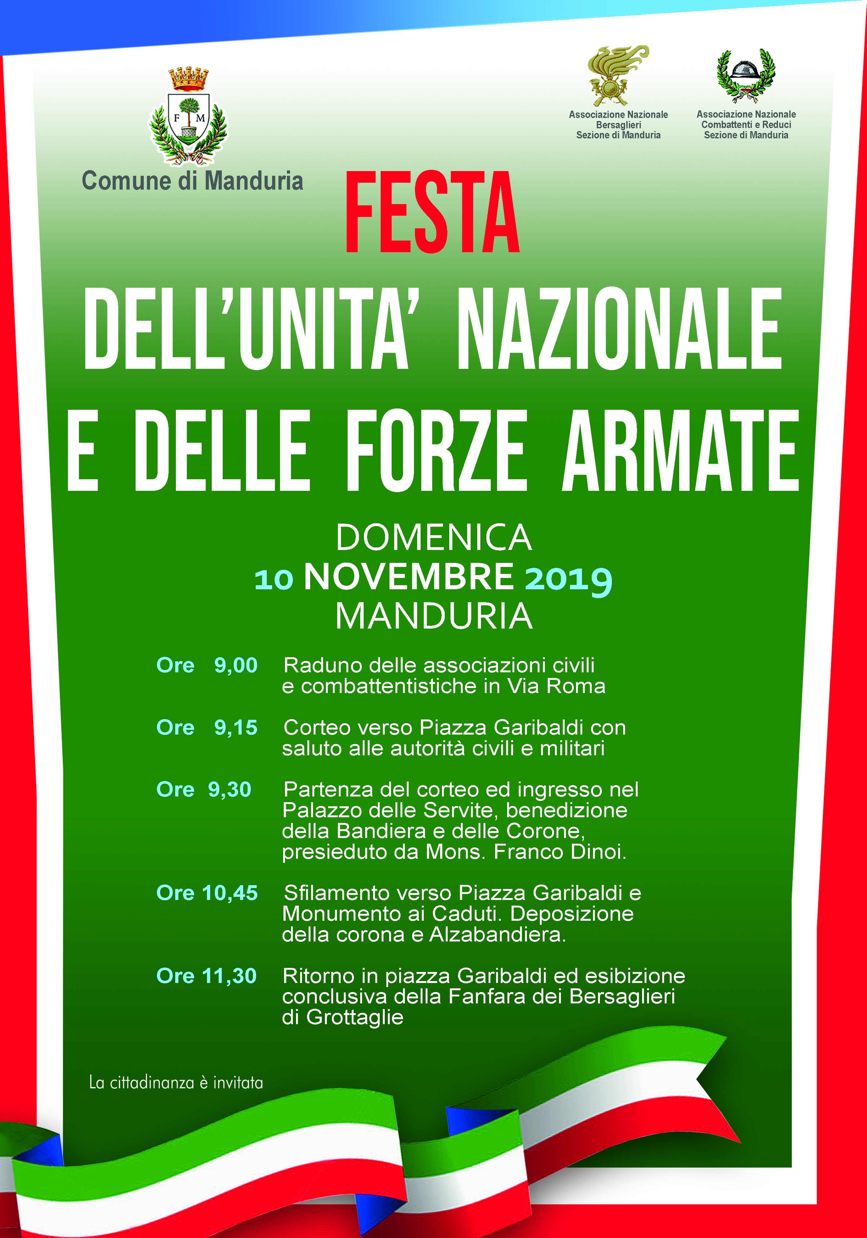 Saranno celebrata domani mattina, a Manduria, la Festa dell’Unità Nazionale e delle Forze Armate. L’iniziativa è promossa dal Comune di Manduria, dalla sezione di Manduria dell’Associazione Nazionale Bersaglieri e dalla sezione di Manduria dell’Associazione Nazionale Combattenti e Reduci.