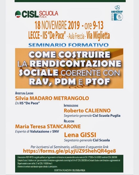 “Come costruire la rendicontazione sociale coerente con RAV, PDM e PTOF”: è il tema del seminario formativo, organizzato da Cisl Scuola Puglia e IRSEF IRFED, in programma il prossimo 18 novembre a Lecce e a Bari.
