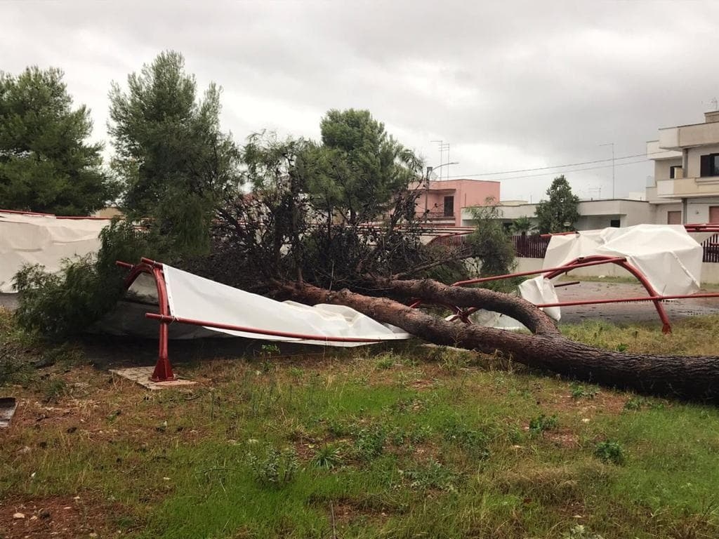 Danni vengono segnalati anche nel cortile interno del liceo classico “De Sanctis” di Manduria. Un albero è caduto, travolgendo (come si vede nella foto) una parte della copertura del parcheggio realizzato recentemente.