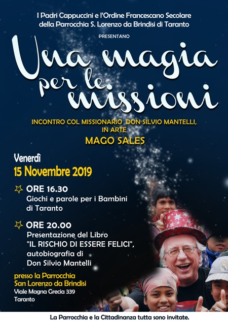 Due gli incontri in programma: uno più adatto ai piccoli alle 16.30 ed uno per la cittadinanza di tutte le età alle 20, nel quale si parlerà di Felicità, di rilettura della propria vita, gioie e dolori, come occasione ed opportunità per dire che la “vita è bella”. Provvidenziale per Taranto oggi più che mai. Mago Sales, infatti, presenterà alla “San Lorenzo” la sua autobiografia, “Il rischio di essere felici”, libro delizioso, un’ottima lettura ed un favoloso regalo per un Natale significativo e duraturo.