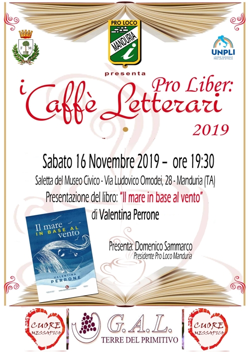 Oggi (sabato 16 novembre) il "Pro Liber - i caffè letterari" riapre i battenti della stagione 2019-2020 ospitando un'autrice a noi particolarmente cara alla terza collaborazione con la Pro Loco di Manduria.