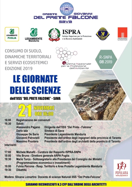 L’auditorium dell’istituto “Del Prete-Falcone” di Sava farà da cornice, oggi pomeriggio (giovedì), alle 16, alla conferenza di presentazione del rapporto annuale ISPRA “Consumo di Suolo, dinamiche territoriali e servizi ecosistemici, Edizione 2019”.
