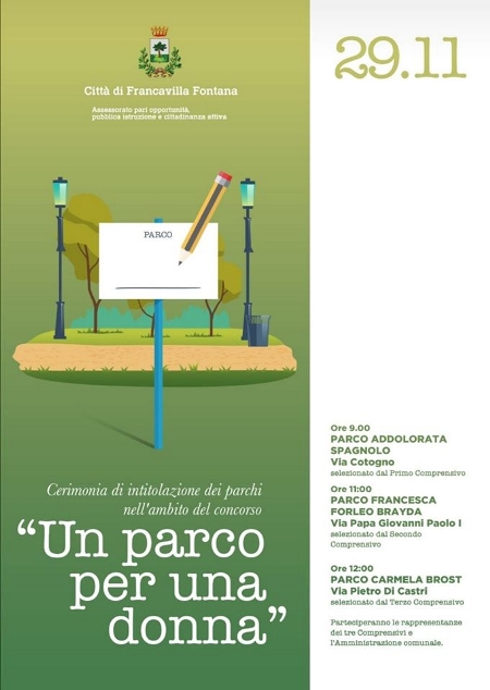 Oggi, a partire dalle ore 9, ha avuto inizio la cerimonia di intitolazione di tre parchi cittadini a tre donne che hanno dato un contributo significativo allo sviluppo della comunità francavillese.