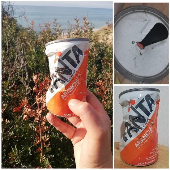 Ma non è l'unica lattina che abbiamo ritrovato... Questa estate passata in un clean up dunale in Zona Villette, incastonata tra vegetazione e monnezza, abbiamo rinvenuto una lattina di FANTA... Purtroppo la data di scadenza non è più visibile ed attraverso una ricerca in rete fra vari siti di collezionisti,salta fuori che la lattina di Fanta è presumibilmente degli anni 80'. Facendo un calcolo approssimativo quest'ultima è lì fra strati di sabbia e vegetazione da circa 40anni...