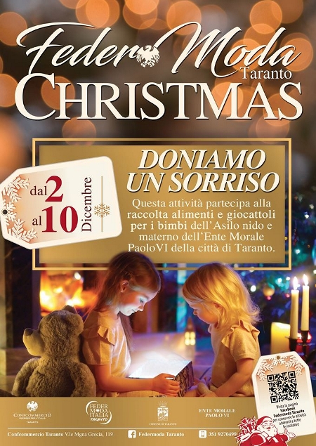 E a proposito di doni, anche quest’anno ritorna ‘FederModa Taranto Christmas’ dal 2 al 10 dicembre. Doni per gli amici e per i propri cari, ma anche per chi è meno fortunato come è nello spirito del Natale, la festa che più di ogni altra apre le porte alla solidarietà. Nei negozi che espongono la locandina ‘Doniamo un Sorriso’ sarà effettuata una raccolta di alimenti e giocattoli per i bimbi dell’asilo nido e della materna dell’Ente morale Paolo VI. L’elenco delle attività aderenti è sulla pagina Facebook Federmoda Taranto.