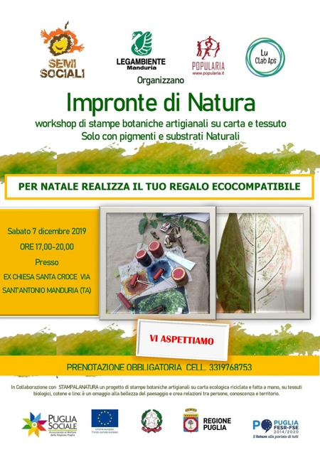 Con l’aiuto di esperte del settore, sabato 7 dicembre, alle ore 17, presso la ex chiesa di Santa Croce, in via per Sant'Antonio a Manduria, nell’ambito del progetto ‘Semi Sociali’ Legambiente propone “Impronte di Natura”, un laboratorio in cui ogni partecipante potrà assistere e partecipare alla tecnica di produzione di un oggetto (fatto con tessuto naturale o carta ecologica) stampato esclusivamente con pigmenti naturali, prodotti da un laboratorio artigianale salentino.
