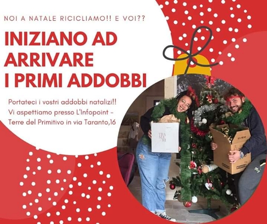 Presso l’infopoint Gal Terre del Primitivo in via Cavour n. 16 a San Marzano di San Giuseppe, la Pro Loco Marciana ha organizzato un punto di raccolta di addobbi natalizi dismessi (palline, corone, ghirlande, catene di luci funzionanti, alberi, strisce etc.) che i volontari dell’associazione riutilizzeranno per addobbare i vicoli e le scalinate del centro storico del paese per creare una magica atmosfera natalizia.