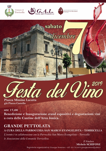 L’Amministrazione comunale di Torricella, in collaborazione con la parrocchia San Marco Evangelista e le associazioni del territorio, ha organizzato la II edizione della Festa del Vino, che si terrà sabato 7 dicembre dalle ore 17,30 in piazza Mimino Lacaita.