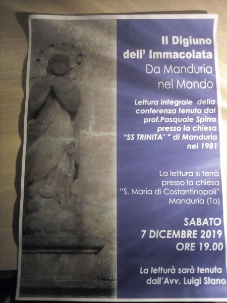 Il digiuno dell’Immacolata, da Manduria nel mondo, al centro di una iniziativa che si svolgerà questa sera, alle 19, presso la chiesa di Santa Maria di Costantinopoli.