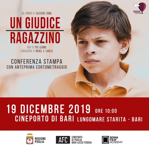 Giovedì 19 dicembre, dalle ore 10 alle ore 13, presso il Cineporto di Bari avrà luogo la conferenza stampa per presentare il cortometraggio “Un giudice ragazzino” regia di Pierluigi Glionna, sceneggiatura di Marika A. Carolla, tratto dall’omonimo romanzo di Salvatore Renna; protagonisti Lorenzo Carulli (il piccolo Rosario), Domenico Panarello, Francesca Baccega. Presenzieranno la conferenza stampa il presidente della Regione Puglia Michele Emiliano, Loredana Capone, assessore alla cultura e al turismo della Regione Puglia, Simonetta Dellomonaco, presidente di Apulia Film Commision, Antonio Parente direttore generale di Apulia Film Commision. La prima nazionale domenica 22 dicembre 2019 a Spinazzola (BT), ore 16,00 presso il Cineteatro Buccomino, ingresso gratuito.