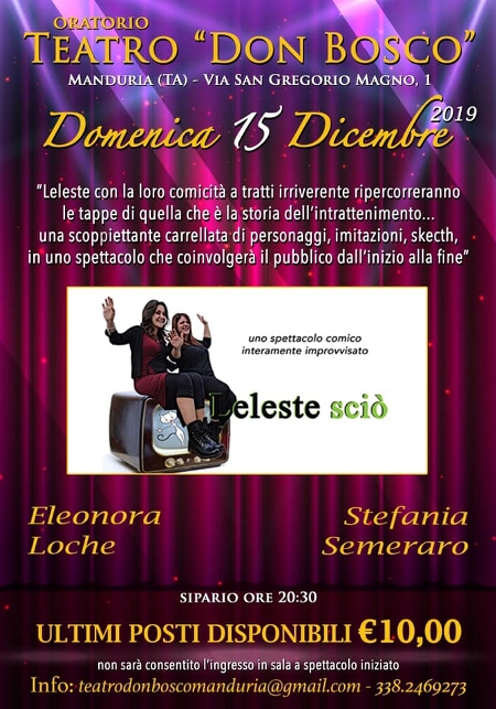 Domenica 15 dicembre al teatro “Don Bosco” a Manduria in via San Gregorio Magno, il duo sarà di scena per il secondo appuntamento della stagione teatrale, per una serata all'insegna dell’improvvisazione teatrale. Leleste con la loro comicità a tratti irriverente, ripercorreranno le tappe di quella che è la storia dell’intrattenimento: dal romanzo alla prima tv che puntava a informare gli spettatori, portava loro spettacoli dell'intrattenimento leggero e anche ad educare, sino ai talk di oggi. Ne scaturirà una scoppiettante carrellata di personaggi, imitazioni e sketch, in uno spettacolo che coinvolgerà il pubblico dall’inizio alla fine. Leleste è un sodalizio tra due attrici, due improvvisatrici: Eleonora Loche e Stefania Semeraro. A loro piace osservare e annusare la vita che passa sotto i loro nasi, piace giocare con parole e storie e nel farlo essere argute e veloci come due gatte che stanno lì a giocare con la propria ed altrui vita, mettendo in scena storie e personaggi mai visti, deliranti e divertenti che rapiranno lo spettatore per condurlo nelle trame e nelle emozioni più vere, storie senza copione, storie totalmente improvvisate.