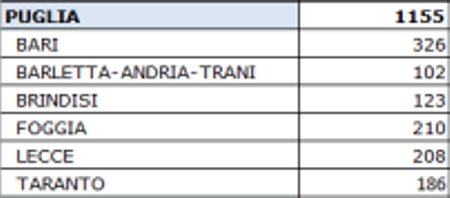 Seguono Taranto (186 casi), Brindisi (123 casi) e Barletta-Andria-Trani (102 casi).