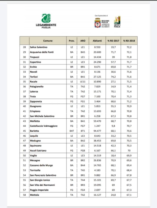 «Anche quest’anno, come l’anno scorso, abbiamo superato il 65% e siamo stati premiati da Legambiente insieme ad altri Comuni ricicloni pugliesi» il commento del sindaco Michele Schifone. «Questo grazie ai cittadini che si impegnano a rispettare le regole della differenziata. Potremmo fare tantissimo se non ci fossero gli abbandoni indiscriminate soprattutto nelle campagne, nelle periferie e nelle marine. Tutto questo peggiora due cose. La prima: andare a recuperare questi abbandoni fa aumentare i costi dell’indifferenziato; la seconda: diminuisce la percentuale della differenziata.