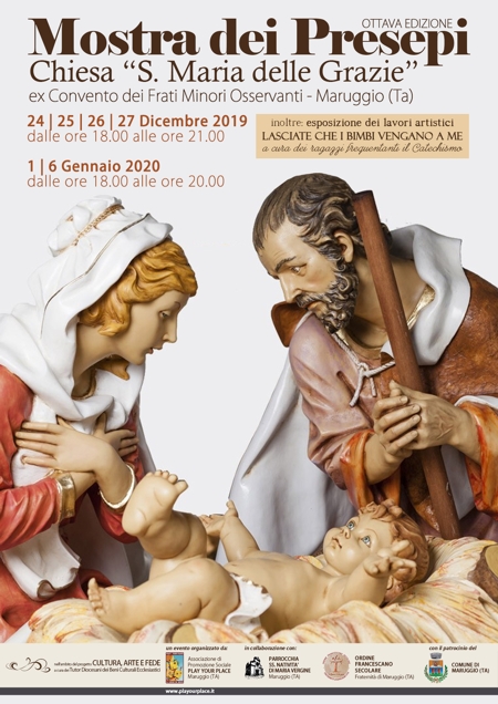 La “Mostra dei Presepi” è organizzata dall’A.P.S. “Play your Place. Il luogo in gioco”, nell’ambito del progetto pluriennnale “Cultura Arte e Fede”, ed è realizzata in collaborazione con la parrocchia “SS. Natività di Maria Vergine” di Maruggio e con il patrocinio del Comune di Maruggio.