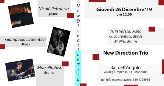 Una nuovissima formazione, appena costituita, fortemente influenzata dal post-bop, in cui il fervore comunicativo, la costante ricerca dell’interplay, la spiccata personalità stilistica e un sound moderno rappresentano le principali caratteristiche. Il New Direction Trio, composto da Nicolò Petrafesa (piano), Giampaolo Laurentaci (contrabbasso) e Marcello Nisi (batteria), sarà ospite al Bar dell’Angolo (Via degli Imperiali, 14 – Manduria) giovedì 26 dicembre alle ore 22.