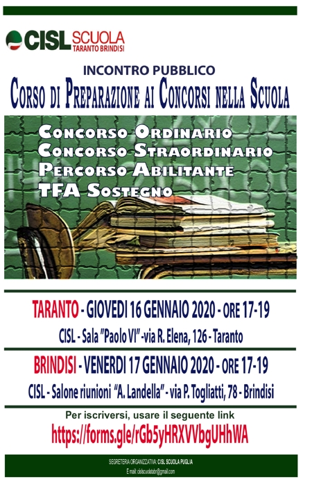 La Cisl Scuola Taranto Brindisi terrà, nelle sedi provinciali della Cisl, due incontri nei quali, oltre a illustrare il Decreto,