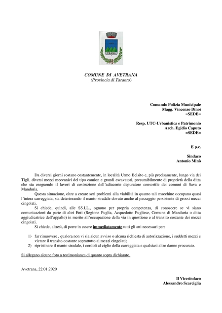«Questa mattina ho provveduto ad informare i locali uffici di Polizia Municipale e Tecnico di quanto sta accadendo il località Urmo Belsito: grossi mezzi industriali e cingolati che sostano perennemente lungo la via dei Tigli ostacolando la normale viabilità e distruggendo tutto il manto stradale. Hanno mai chiesto un’autorizzazione a fare ciò? Tra l’altro in un Comune diverso da quello dove eseguono i lavori?