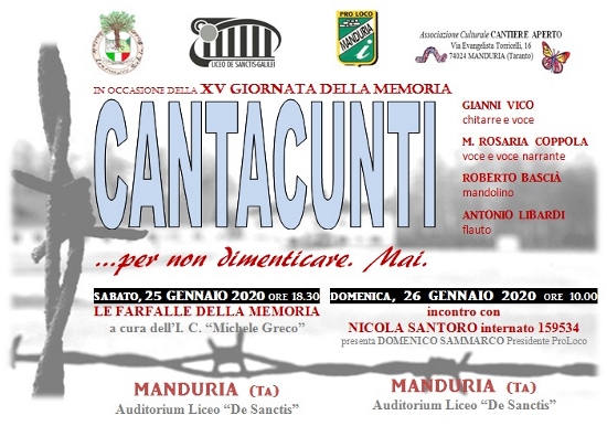Domani i Cantcunti saranno la colonna sonora de “Le Farfalle della Memoria”, spettacolo a cura delle classi quinte della scuola primaria dell’I. C. Michele Greco di Manduria, mentre domenica mattina si troveranno a dividere il palco con Nicola Santoro, che presenterà il libro “Internato 759534”, storia autobiografica della sua esperienza nei campi di concentramento, in un evento a cura della Pro Loco di Manduria e moderato dal suo presidente, Domenico Sammarco.