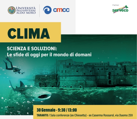 Il 30 gennaio a Taranto, nell’ex Cappelletta della caserma Rossarol, sede del Dipartimento Jonico dell’Università degli Studi “Aldo Moro” di Bari, si terrà un seminario con la partecipazione di scienziati ed esperti per analizzare le principali sfide legate ai cambiamenti climatici, le conseguenze e le soluzioni su cui è possibile lavorare.