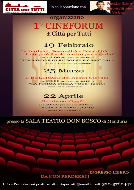 Nuova iniziativa dell’associazione “Città per Tutti”, promossa in collaborazione con l’oratorio della parrocchia intitolata a San Giovanni Bosco. Tre “cinedibattiti” su tre argomenti sempre attuali: disabilità e sessualità, bullismo e razzismo.