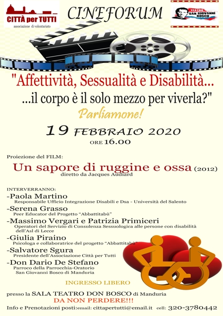 Sarà proiettato il film “Un sapore di ruggine e ossa”. Interverranno: Paola Martino, responsabile Ufficio Integrazione Disabili e DSA dell’Università del Salento; Serena Grasso, peer educator del progetto “Abbattitabù”; Massimo Vergari e Patrizia Primiceri, operatori del servizio Consulenza Sessuologica alle persone con disabilità dell’Università di Lecce; Giulia Piraino, psicologa e collaboratrice del progetto “Abbattuitabù”; Salvatore Sgura, presidente dell’associazione “Città per Tutti”; don Dario De Stefano, parroco della parrocchia-oratorio “San Giovanni Bosco”.